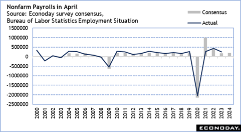 Econoday’s forecast for the change in nonfarm payrolls in April is a rise of 225 ,000. This sort of gain is consistent with a healthy labor market well able to absorb those unemployed or just entering the workforce. However, it is notable that the April nonfarm payroll change has a strong tendency to come in below market expectations and also to be subsequently revised down. Whatever the month-over-month change in April, it will need to be considered in the context of the revisions to the prior two months. March saw an increase of 303,000 and February was up 270,000. The average monthly gain for the first quarter 2024 was 276,000. It is probable that April will not nearly match that pace at the start of the second quarter.