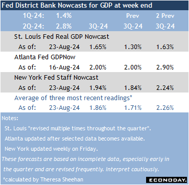 The indicators on the calendar won’t contribute to expectations for the second estimate of second quarter GDP at 8:30 ET on Thursday. There isn’t likely to be much of a revision from the advance estimate of up 2.8 percent. At the moment, the GDP Nowcasts for the third quarter look for growth below that at around perhaps just under 2 percent.