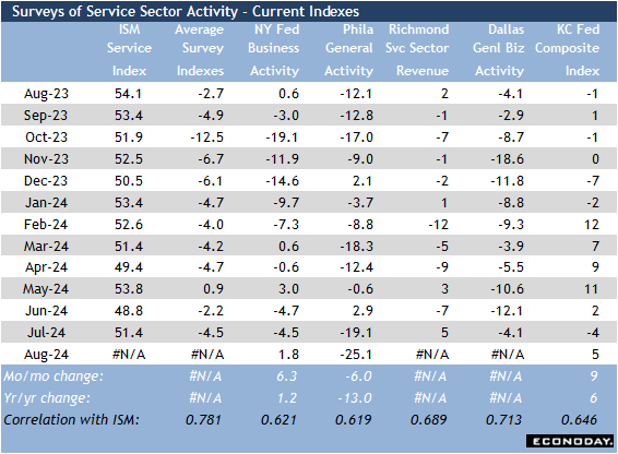 What may get more attention is the Fed distract bank surveys for manufacturing and services in August. Three of the five surveys are now available from New York, Philadelphia, and Kansas City. The Dallas Fed manufacturing survey will be released at 10:30 ET on Monday and service sector survey at 10:30 ET on Tuesday. The Richmond Fed’s surveys of manufacturing and services will be reported at 10:00 ET on Tuesday. On balance, the surveys so far seem to indicate some improvement in conditions in August. However, the picture is incomplete.
