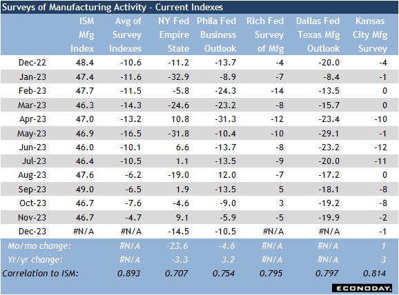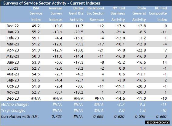 The Dallas Fed’s general business conditions index for manufacturing for December is at 10:30 ET on Tuesday and the services sector at 10:30 ET on Wednesday. The Richmond Fed will release both its manufacturing composite index and service sector revenues index at 10:00 ET on Wednesday.