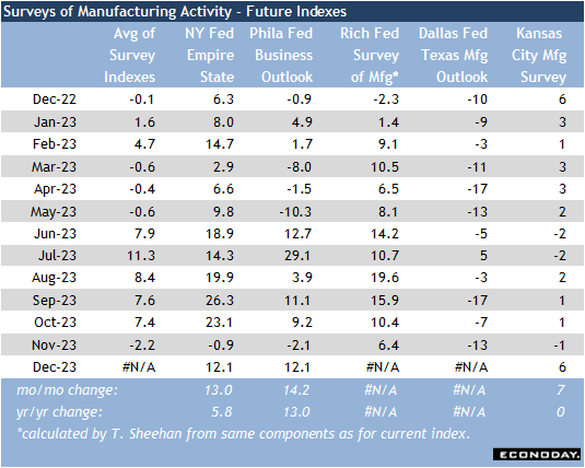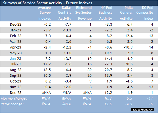 The data available for December from the New York, Philadelphia, and Kansas City Feds point to soft manufacturing conditions continuing in December, although their indexes for future conditions have improved notably for the six-month outlook. The indexes for the service sector suggest overall tempered expansion for December, but against a backdrop of choppy performance in recent months. Future indexes tell a similar story underlined by uncertainty across regions.