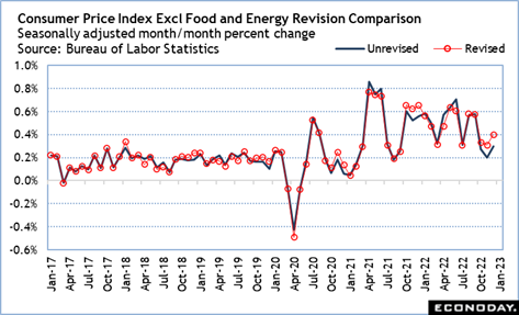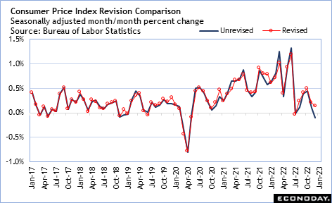 On Friday, the Bureau of Labor Statistics will release the annual revisions to the CPI which can include up to five years of revisions to the seasonally adjusted indexes. Normally the revisions are small and do not impact the underlying picture of consumer price changes, though the data released in February 2022 presented an unpleasant surprise with significant upward revisions that helped keep the FOMC on the path of tightening monetary policy. The revisions will be watched closely to see if there is a surprise in this year’s data as well – whether to the up or downside – which might affect the tone of forecasts in the FOMC summary of economic projections which will be updated at the March 19-20 meeting.