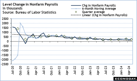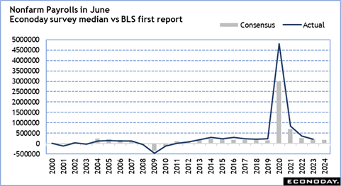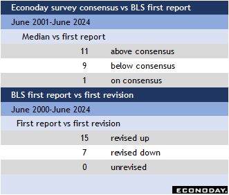 The June employment numbers are anticipated to tell much the same story as has prevailed in recent months. The June unemployment rate is expected to hold at 4.0 percent for a second month in a row. If the rate is a bit higher, it would be by no means high and would not be showing an acceleration in job losses. The change in nonfarm payrolls has early forecasts of around up 175,000. This would represent a modest slowing in the pace of job gains, but certainly not out of line with the underlying trend, and not out of line with FOMC forecasts. Historically, June has a slight tendency to come in above expectations. More importantly, the month has solid tendency to be revised higher in the July report. Right now, the monthly average for the second quarter 2024 looks roughly 200,000 which suggests the labor market remains tight and expansion modest.