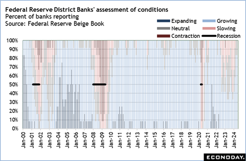 Central to this is the next Beige Book at 14:00 ET on Wednesday which will provide anecdotal evidence about conditions across the 12 Fed district banks for the period between mid-May and early July. Recent Beige Books have indicated that the US economy has pulled away from a potential recession and returned to more broadly – if slightly – expansionary activity. The next report may lose some of that firmer growth as consumers backed away from spending, business conditions softened somewhat, and the outlook was more uncertain. However, the report also will reflect conversations with respondents from before Chair Jerome Powell’s monetary policy testimony and the most recent reports on inflation. It won’t take into account the brightened prospect for a rate cut or that there is some evidence that consumer spending started to pick up in early July.