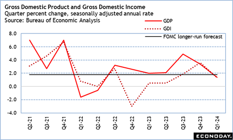 The report most likely to have an impact on the FOMC deliberations is the advance estimate of second quarter GDP set for release at 8:30 ET on Thursday. The GDP Nowcasts point to growth stronger than in the first quarter. Expectations are an end to the series of outperformance in 2022-2023 with the economy now growing more in line with the FOMC’s longer-run forecast of 1.8 percent. The June report on retail sales was above expectations and included upward revisions in the prior month, so the personal consumption expenditures contribution could be more positive than previously expected. However, the GDP report will include annual revisions. There probably won’t be big changes to the path of growth in recent quarters.