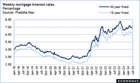 There’s already a good sense that the housing market continues to feel the pinch of mortgage rates hovering near the 7 percent mark back in May. The dip in the rate for a 30-year fixed rate mortgage in the last two weeks won’t be visible in most of the housing numbers for another month. Only the NAR pending home sales index for May on Thursday at 10:00 ET will offer much indication of movement in existing home sales. Contracts taken out in May will reflect rates mostly for April and early May when at least some homebuyers were acting while they had a lock on rates around 6.8 percent and at a time when rates were trending higher.