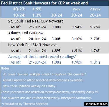 The third and final estimate of first quarter GDP is set for release at 8:30 ET on Thursday. It will put the seal on expansion for the January-March period. However, it is the advance report for second quarter GDP at 8:30 ET on Thursday, July 25 that is now in the sights of Fed watchers. The three Fed district bank GDP Nowcasts are telling somewhat different stories about growth in the second quarter ranging from about up 1 percent to up 3 percent. The midpoint of slightly under 2 percent suggests that growth strengthened somewhat from 1.3 percent reported in the second estimate of the first quarter. Ongoing modest expansion is the sort of scenario that will keep monetary policy on hold.