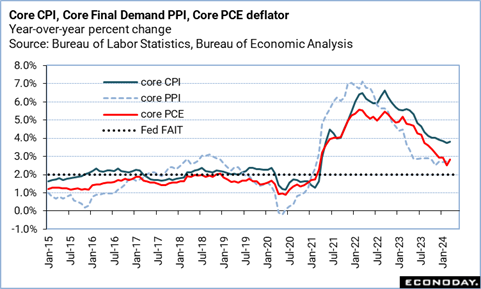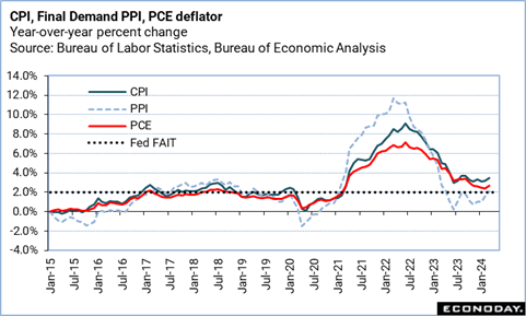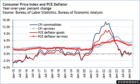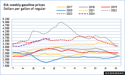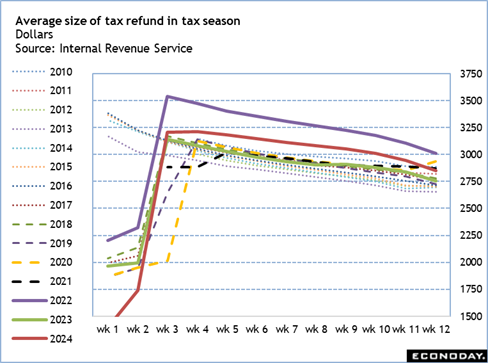 Economic growth should still look supported by consumer spending in the first month of the second quarter 2024. The April numbers on retail and food services sales at 8:30 ET on Wednesday should reflect the uptick in the pace of sales of motor vehicles. Gasoline prices were on the rise in April, but that is a normal pattern as refineries change over to summer fuel formulations and should be accounted for in seasonal adjustment factors. However, travel around the holidays and spring break may have increased the volume of sales, so it could be a positive for retail as well. Spending in April may get a boost from tax refunds in 2024 which are larger than those sent out in 2023. Tax refunds go to buying big ticket items such as cars and appliances, but could also be directed to savings or paying down debt.