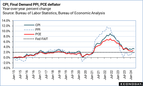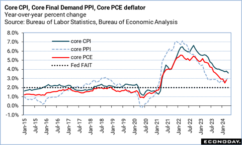 The most looked at data will probably be the PCE deflator for April in the report on personal income and spending at 8:30 ET on Friday. Although the uptick in March for the year-over-year change (PCE deflator up 2.7 percent, core PCE deflator up 2.8 percent) could well be reversed in the April report, it is far too soon to project that disinflation has resumed in a way that will encourage Fed policymakers to lower rates sooner than their hawkish signals would suggest. Chair Jerome Powell has discussed the “sideways” performance of the inflation indicators in the first quarter. It will probably need reports for the full second quarter before the FOMC has greater confidence that inflation is sustainably moving back to the Fed’s 2 percent objective.