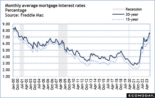 October NAR data on sales of existing homes on Tuesday at 10:00 ET should be more of the same – a softening pace of sales and low inventories of homes for sale as current owners hold on to their low mortgage rates, and consequent support for home prices as buyers snap up available units in the more affordable price ranges. Existing homes sold in October will reflect contracts taken out in August and September when the Freddie Mac 30-year rate for a fixed rate mortgage averaged around 7.07 percent and 7.20 percent, respectively. The impact of the jump in the rate to an average of 7.65 percent in October will not yet be visible.