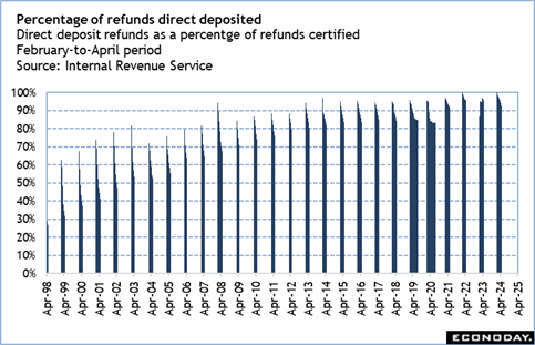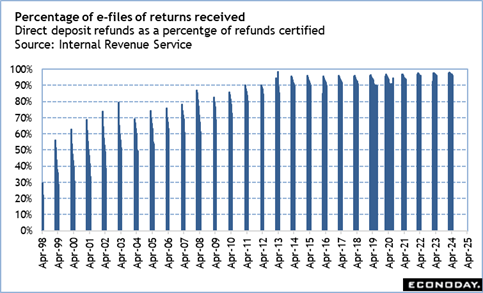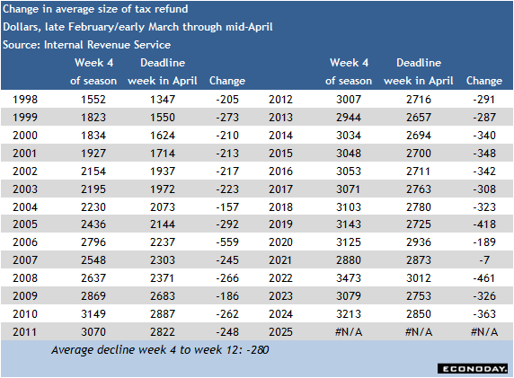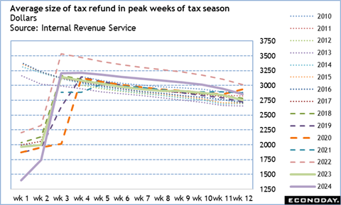 Individual taxpayers with simple returns who anticipate a refund tend to be the first wave of tax filings. Expansion of the IRS Direct File program to 25 states from 12 in 2024 means that more of these tax returns are likely to be filed sooner. In any case, by the third week of the filing season, it is typical to see the size of any tax refunds peak as those eligible for refunds move quickly to get them.