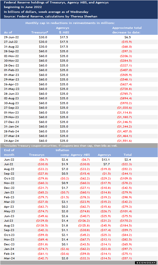 While expectations are universal that the FOMC will remain on hold with interest rates at the April 30-May 1 meeting, there is a good possibility that it will elect to make an announcement about a change in balance sheet policy. At his March 20 press conference, Chair Jerome Powell signaled that the FOMC was prepared to adjust the pace of reductions in balance sheet reinvestment to slow the shrinking of the Fed’s holdings of US treasuries and agency mortgage-backed securities.