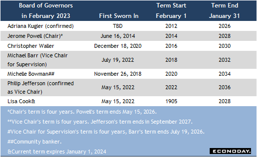 The Board now has one holdover from the Obama Administration (Chair Jerome Powell) and three from the Trump years (Governor Christopher Waller, Vice Chair for Supervision Michael Barr), and Governor Michelle Bowman in the community banker spot. The Biden Administration appointees are governors Adriana Kugler, Vice Chair Philip Jefferson, and Lisa Cook.