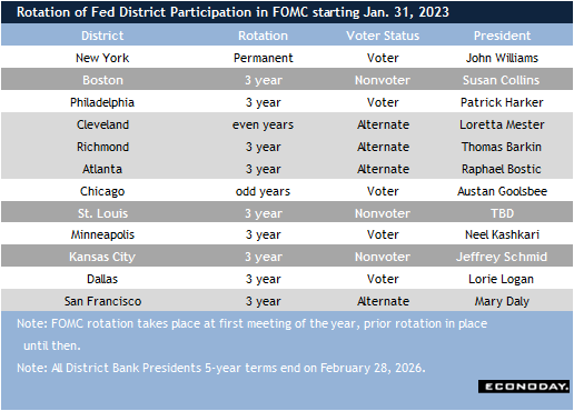 As a footnote, the search goes on for a successor to St. Louis Fed President James Bullard who retired in August. In 2023, the St. Louis Fed presidency is a nonvoter on the FOMC, so the absence of a sitting president for that district has no impact on the committee vote. Until a new president is named and seated, First Vice President Kathleen O’Neill Paese will be the voice of the St. Louis Fed at the FOMC meetings. In 2024, the St. Louis Fed is an alternate voter for the Atlanta district.