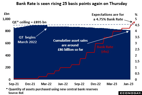 Stubbornly high inflation and accelerating wage growth would seem to leave the BoE with little choice but to hike Bank Rate for what would be a thirteenth consecutive meeting on Thursday. The market consensus is another 25 basis point increase that would put the benchmark rate at 4.75 percent, its highest level since April 2008 and boost the cumulative tightening to some 465 basis points in just a year-and-a-half. In recent meetings, the MPC’s two main doves, Swati Dhingra and Silvana Tenreyro (the latter’s last meeting), have dissented in favour of no change but they may struggle this time to justify keeping rates on hold. Indeed, there must also be a chance that at least one of the hawks will want a more aggressive 50 basis point move.