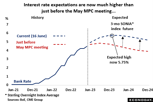 Meantime, expectations for where Bank Rate might top out continue to be ratcheted up, and significantly so. Just before the May MPC meeting financial markets were pricing in a peak to 3-month money rates of about 4.85 percent in September. Investors also seemed confident that the BoE would be lowering key rates over much of 2024 and anticipated a sub-4 percent level by the end of the year. However, new concerns that policy is not tight enough have boosted the expected high to fully 5.75 percent this December and no official cut is seen until around the middle of 2024. Indeed, concerns that the policymakers have been too slow to act on inflation helped gilt yields last week to rise above the levels seen just after September’s disastrous mini-Budget.