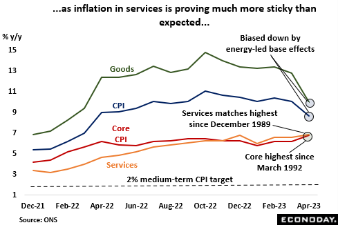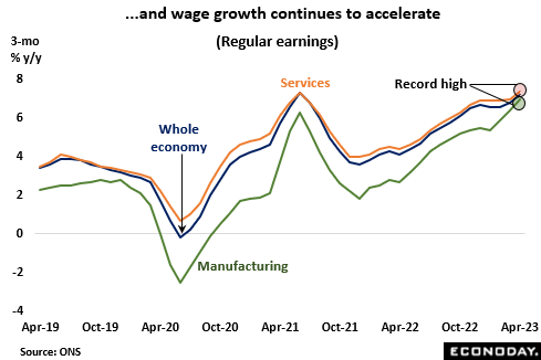 To this end, wages remain a real problem with pay growth climbing at a rapid and accelerating rate right across the economy. In the three months to April, average annual growth of regular earnings in services stood at fully 7.4 percent (in financial services some 9.2 percent), just a tick above its manufacturing counterpart. Both readings were new record highs. For the economy as a whole, the rate was 7.2 percent, only 0.1 percentage point below the Covid-distorted peak seen in June 2021. Indeed, the single month rate was some 7.5 percent. Such values are completely inconsistent with the 2 percent CPI target and underline the ongoing tightness of the labour market. They also in part reflect successful and quite widespread industrial action.
