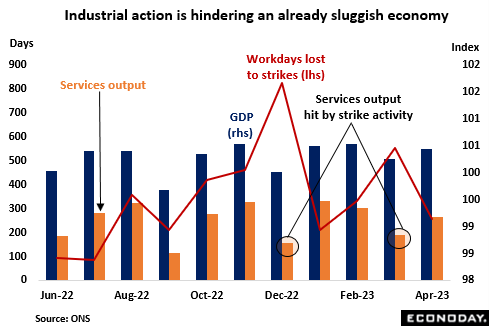In fact, strike activity looks to have had a particularly significant impact on services. Sizeable monthly declines in the sector’s output in both December 2022 and March this year coincided with steep increases in working days lost. That said, while the economy is clearly very sluggish, first quarter GDP (0.1 percent) at least expanded and the BoE has adjusted its growth forecast for 2023-2025 sharply higher. The deep and protracted recession shown in the February Monetary Policy Report (MPR) has been revised away and in three years’ time total output is now expected to be some 2.25 percent higher. If nothing else, this makes raising Bank Rate again this week politically a little easier to sell. Even so, business surveys still point to the current quarter being another poor period for growth with household spending in particular likely to be weighed down by the high cost of living and rising borrowing costs.