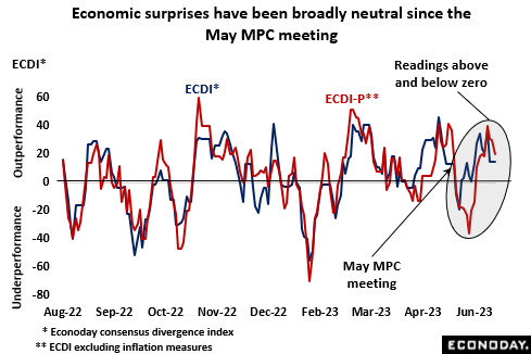 Since the May MPC meeting, surprises in the economic data have been reasonably balanced – the UK’s ECDI and ECDI-P have averaged 12 and 9 respectively over the period. However, both measures have been consistently above zero throughout June and the April CPI report was much stronger than the market (and bank) expected. This outperformance should help to limit worries about the potential damage that another policy tightening might do to the more interest rate sensitive sectors.