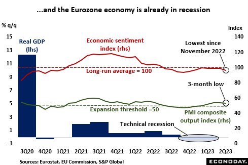 As the ECB noted in last month’s bulletin, the bottom line is “the inflation outlook continues to be too high for too long.” As such, another 25 basis point hike in key interest rates this week would appear to be nailed on. However, the May data offer hope that policy is finally beginning to work, notably in the consumer sector and housing market. Indeed, with recession, albeit only very mild at this stage, already in place, the risk of monetary overkill is rising steadily and the debate about what to do with policy at the next meeting in July could well be even more heated than usual.