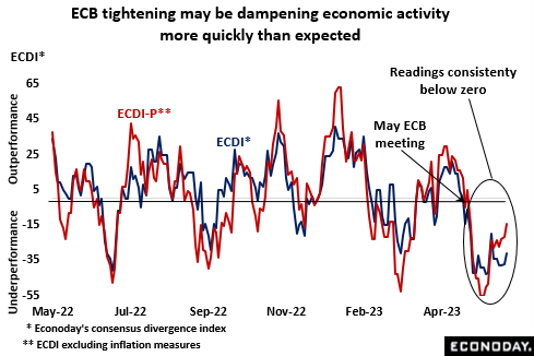 In fact, economic indicators in general released since the May ECB meeting have been surprisingly weak. Econoday’s consensus divergence index (ECDI) was sub-zero over the entire period meaning that forecasters have been consistently too optimistic. Earlier hopes that growth was holding up much better than originally expected now seem less well founded and on current trends, overall economic activity this quarter will also be disappointingly soft. From a policy perspective, the interest rate outlook remains crucially tied to inflation so negative ECDI readings may not seem too important. However, sustained sub-par economic activity must eventually weigh on prices and so bolster the chances of a faster slowdown in core inflation.