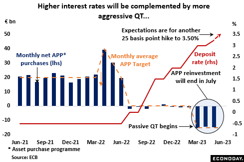 Almost without exception, official comments since the May policy meeting have indicated that Governing Council (GC) members think key interest rates need to be higher if inflation is to be brought back under control. This clear bias has left investors anticipating another 25 basis point hike on Thursday which would put the deposit rate at 3.50 percent, its highest level since November 2008, the refi rate at 4.00 percent and the rate on the marginal lending facility at 4.25 percent. It would also boost the cumulative tightening so far to fully 400 basis points in less than a year.