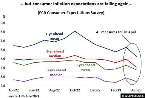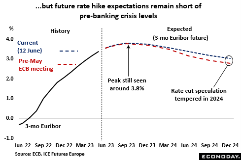 Financial markets currently see the peak to 3-month money rates around 3.8 percent in September, little changed from just before the May ECB meeting but well down from the near-4.1 percent level priced in just before the collapse of Silicon Valley Bank (SVB). However, expectations for ECB easing have been tempered and rates are now seen only marginally lower by the end of this year and still above 3 percent in December 2024.