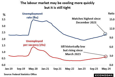 However, the labour market has shown signs of cooling more quickly than earlier in the year. Hence, the number of people out of work was up 2.1 percent in May, one of the steepest monthly increases seen since unemployment began rising back in March last year. At 2.3 percent, the unemployment rate matched its highest level since the end of 2021 while the unemployment/vacancy ratio climbed to its highest mark since April that year. That said, both measures remain well below their long-run average, indicating that overall conditions remain tight.