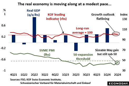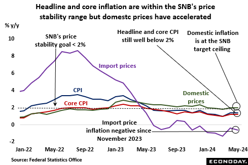 On the whole, medium-term interest rate expectations in financial markets have changed little since the March cut. A 25 basis point ease is still not fully priced in for this month and at 1.15 percent, the year-end call is almost identical to that just before the last MPA. Indeed, rates are now seen only a few basis points firmer at 1.12 percent by December 2025. In contrast to many other central banks, there is only limited room for additional SNB easing even with inflation so low.