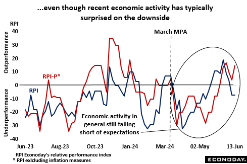 In general, economic data released since the March MPA have surprised on the downside. Over that period, Econoday’s RPI averaged minus 7 and its inflation-adjusted counterpart a marginally weaker minus 9. Neither reading is far enough below zero as to signal significant underperformance but note that CPI inflation surprised on the upside in two of the three months.
