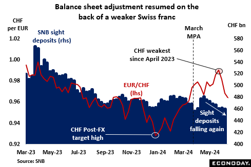 Meantime, the strength of the franc at the start of the year effectively curtailed the SNB’s efforts to shrink its balance sheet during the first quarter of the year. However, the subsequent slide in the unit meant that the bank was subsequently able to resume its asset sales programme and sight deposits have now fallen nearly CHF300 billion since September 2022. Still, the depreciation at one point was fast enough to prompt SNB Chief Thomas Jordan to say that the bank saw a small upside risk to its inflation forecast due to exchange rate weakness and warned that it might be forced to intervene and sell foreign exchange. His comments triggered a partial reversal and at EUR/CHF0.9663, the cross-rate is probably close to where the bank would like to see it. Even so, FX developments so far in 2024 underline the sensitivity of the SNB to exchange rate volatility in either direction.