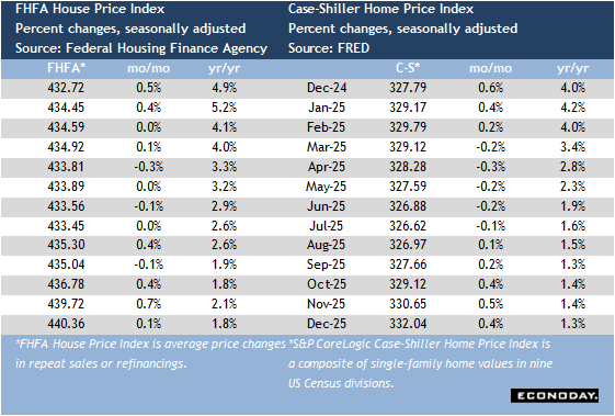 Although the reports on home price indexes for December are relatively old at this point, they may be a harbinger for the broader housing market as the spring buying season approaches. When taken in context with the numbers for home sales in January and pessimism in February from homebuilders, signs of firming in home prices indicate that homebuyers are having to compete more for available units. This has a negative impact on home affordability at a time when home prices are elevated and often beyond the means of moderate income households.