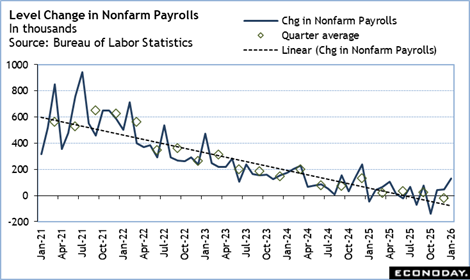 Nonfarm payrolls registered a solid 130,000 increase in January with private payrolls up 172,000 and government jobs down 42,000. However, job gains were mostly in a few narrow sectors as they have been in recent months. These occurred in healthcare and social assistance (123,500), professional and business services (up 34,000), and construction (up 33,000). Payroll employment changed little in 2025 (+15,000 per month on average). The unemployment rate ticked down a tenth to 4.3 percent in January. The January data extends the story of soft hiring with a few exceptions while job losses are relatively few and mainly from industries eliminating less profitable locations and services and/or adopting AI tools.