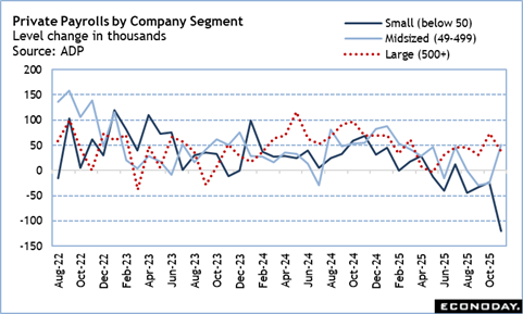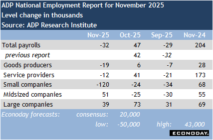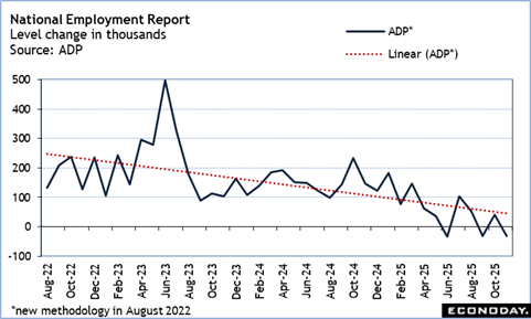ADP reported a decrease of 32,000 in private payrolls in November. Payrolls have now declined in three of the past four months. Payrolls are trending down, if unevenly.