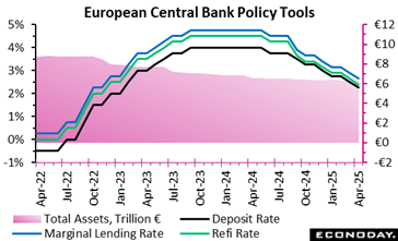 In April 2025, the ECB cut its three key interest rates by 25 basis points, lowering the deposit facility rate to 2.25 percent, the main refinancing operations to 2.40 percent, and the marginal lending facility to 2.65 percent. This move reflects growing confidence in the euro area’s disinflation trajectory, as both headline and core inflation—especially in services—have eased. Underlying inflation appears aligned with the ECB’s 2 percent medium-term target, aided by moderating wage growth and resilient profit margins that help absorb remaining cost pressures.