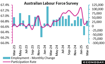 Labour market conditions in Australia rebounded in March, with employment increasing sharply from a previous decline and the unemployment and participation rates continuing to indicate very tight conditions. This will likely keep the focus of the Reserve Bank of Australia on risks to the inflation outlook despite concerns about the impact of global trade tensions.