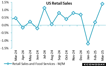 Excluding gasoline, retail sales rose by 1.7 percent, speeding up from February’s 0.3 percent rise, and jumped 5.3 percent from March 2024 vs. +3.8 percent on an annual basis in February.