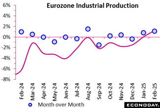 Euro area industrial production showed renewed momentum in February 2025, rising by 1.1 percent compared to January, outpacing the previous month’s 0.6 percent growth. This rebound suggests short-term resilience despite mixed sectoral performances. Non-durable consumer goods led the monthly expansion with a sharp 2.8 percent rise, indicating robust consumer demand for everyday items. Capital goods also posted a solid 0.8 percent increase, reflecting moderate investment activity, while declines in energy (minus 0.2 percent) and durable consumer goods (minus 0.3 percent) hint at ongoing caution and subdued long-term consumption.
