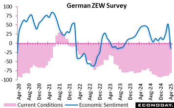 While sentiment has nosedived, the assessment of Germany’s current economic conditions remained in deep negative territory but showed slight improvements, rising by 6.4 points to minus 81.2, 4.8 points above the consensus. The deep negative reading continues to highlight the fragility of the recovery. Export-heavy sectors, including automotive, chemicals, and engineering—previously showing optimism—are now particularly vulnerable to rising trade tensions. Sentiment across the euro area echoed Germany’s gloom, with the outlook tumbling to minus 18.5 points and current conditions at minus 50.9.