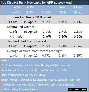 The most important piece of US economic data in the April 18 week was the March report on retail and food services sales. Although total sales rose 1.4 percent in March and ended the quarter on an up note, sales were up only 0.2 percent in February and down 1.0 percent in January. The quarter as a whole isn’t that strong a performance for consumer spending and probably won’t be a standout for personal consumption expenditures beyond the durable goods components. Consumers are bringing forward purchases of big-ticket hard goods to avoid expected price increases from tariffs and/or possible shortages along the supply chain which was one of the reasons for the recent inflation episode. The advance estimate of first quarter GDP is set for release at 8:30 ET on Wednesday, April 30.