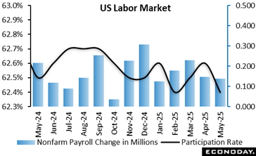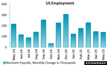 Nonfarm payrolls are up 139,000 in May, a bit above the consensus of up 129,000 in the Econoday survey of forecasters. However, there is a net downward revision to the prior two months of 95,000. The first two months of the second quarter 2025 shows a monthly average increase in payrolls of 143,000, while payroll growth in the first quarter is less than previously thought with a monthly average of up 111,000. Both are below the monthly average of up 209,000 in the fourth quarter 2024. Hiring is ongoing in the present economy, but the underlying trend is slower. Hiring is more diffuse and subject to uneven demand in the major sectors.