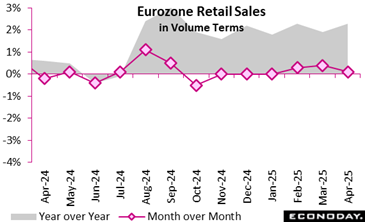 On a monthly basis, Eurozone retail trade volume went up slightly by 0.1 percent, following a modest revised gain of 0.4 percent in March, indicating a slower pace in consumer momentum. Sector-wise, food, drinks, and tobacco sales went up by 0.5 percent, while non-food products also went up by 0.3 percent. Automotive fuel sales offered a modest lift, rising by 1.3 percent, possibly driven by increased mobility or seasonal factors.