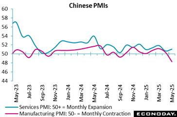 The S&P Global China manufacturing PMI showed a sharp deterioration in conditions in the sector in May, with the headline index falling to 48.3 from 50.4 in April. This is the first time this survey has shown contraction in the sector since September 2024 and the index is now at its lowest level since September 2022. Official PMI survey published on the weekend also showed contraction in the sector in May.