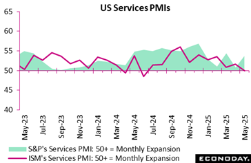 The S&P Global US Composite Purchasing Managers’ Index came in at 53.0 in May, up from 50.6 in April – signaling an uptick in services sector activity while manufacturing output dipped – and above the 52.1 consensus in the Econoday survey of forecasters.