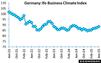 Germany’s business sentiment gained traction in June 2025, with the business climate index climbing to 88.4 from 87.5 in May, its highest level this year. The uplift was driven primarily by improved expectations across sectors, signalling a cautious return of confidence in Europe’s largest economy. Although current conditions improved only slightly, the overall mood reflects growing optimism.