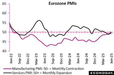 Price trends diverged. Input inflation continued to cool, especially in manufacturing, yet selling prices rose faster than in May, led by strong price hikes in services. Manufacturers cut output prices, responding to weak cost pressures and tepid demand.