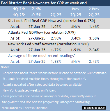 Early forecasts for growth in the second quarter took a hit with the Friday release of the data on personal income and spending in May. The Atlanta Fed’s GDPNow measure was revised lower to up 2.9 percent in the second quarter from 3.4 percent in the prior forecast. If the most reliable of the three Fed district bank estimates of GDP is signaling a loss of momentum in the data at the mid-point of the second quarter, then more soft numbers for June could erode it further. Trade flows may be more normal in the second quarter, but this won’t disguise weaker consumer spending and business investment.
