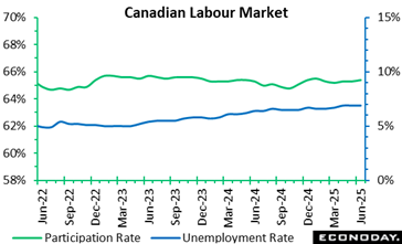 Surprise. The Canadian economy created a stunning 83,100 jobs in June, far more than the consensus expectation of 8,000 in an Econoday survey of forecasters. The economy hadn’t added that many jobs since December 2024. The unemployment rate ticked down to 6.9 percent while expectations had centered on an increase to 7.1 percent from 7.0 percent. This was the first unemployment rate decline since January. The participation rate edged up to 65.4 percent from 65.3 percent.