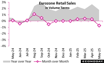 Retail trade in the euro area showed mixed dynamics in May 2025, reflecting the impact of consumer caution and shifting spending patterns. Compared to April, retail volumes declined by 0.7 percent, reversing the modest 0.3 percent growth recorded in the previous month. All major sectors experienced monthly contractions: food, drinks and tobacco dropped by 0.7 percent, non-food products by 0.6 percent, and automotive fuel by a sharper 1.3 percent, pointing to broader demand-side restraint possibly linked to cost-of-living concerns or volatile fuel pricing.