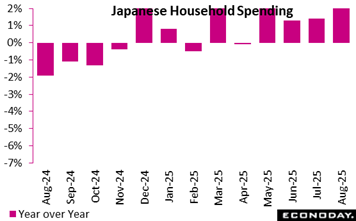 Japan’s real household spending rose 2.3 percent in August from a year ago, well above the expected 1.0 percent increase, and topping the highest forecast of up 1.7 percent. This is the fourth consecutive annual increase. Real household spending was up 1.4 percent in July.